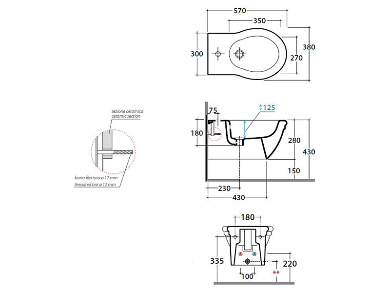 Биде подвесное GLOBO Paestum PAS10.BI, с переливом, с 1 отверстием под смеситель, в комплекте с креплением, размер 57х38x28 см, цвет белый.