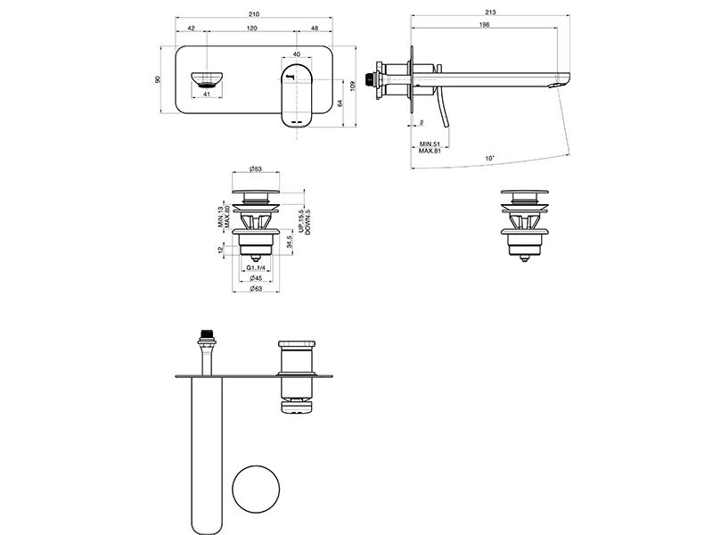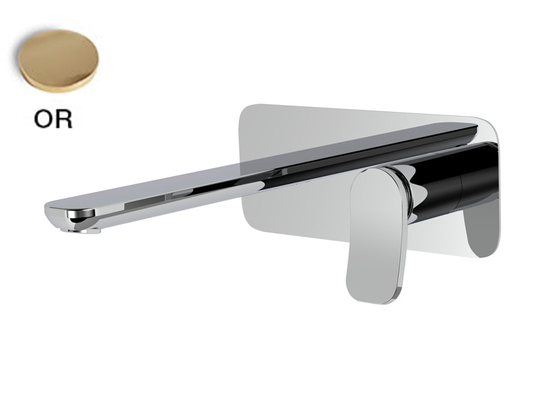 Cмеситель для раковины для настенного монтажа Fima Carlo Frattini FLO' F3821WLX5OR, цвет золото. Только внешняя часть, излив 200 мм, максимальная скорость потока при 3 бар: 5 л/м, донный клапан click-clack 1``1/4, металлическая пластина, внутренняя часть (арт. F3600W) заказывается отдельно.