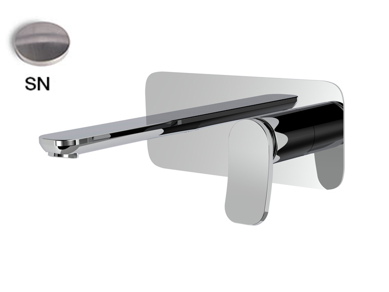 Cмеситель для раковины для настенного монтажа Fima Carlo Frattini FLO' F3821WX5SN, цвет никель брашированный. Только внешняя часть, излив 150 мм, максимальная скорость потока при 3 бар: 5 л/м, донный клапан click-clack 1``1/4, металлическая пластина, внутренняя часть (арт. F3600W) заказывается отдельно.