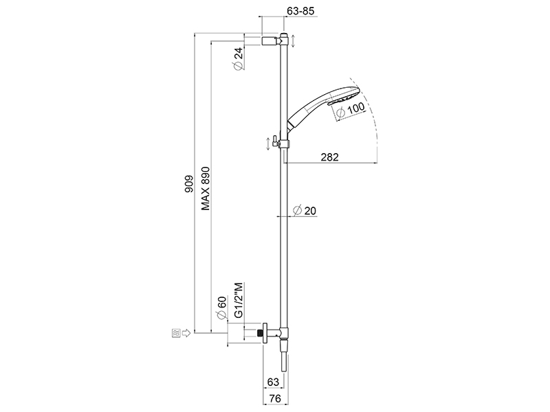 с нижним выходом из стены, d 20 мм. Высота 91 см, расстояние от центральной стойки 89 см. 3х функциональный душ Nova ABS с защитой от известкования, лейка d 100mm. Гибкий шланг из ПВХ длиной 150 см, двойная