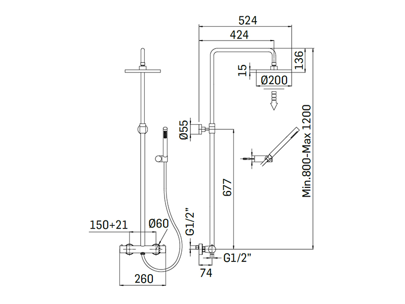 PICO Душевая стойка с термост,смесителем верхним и ручным душем,Matt Black