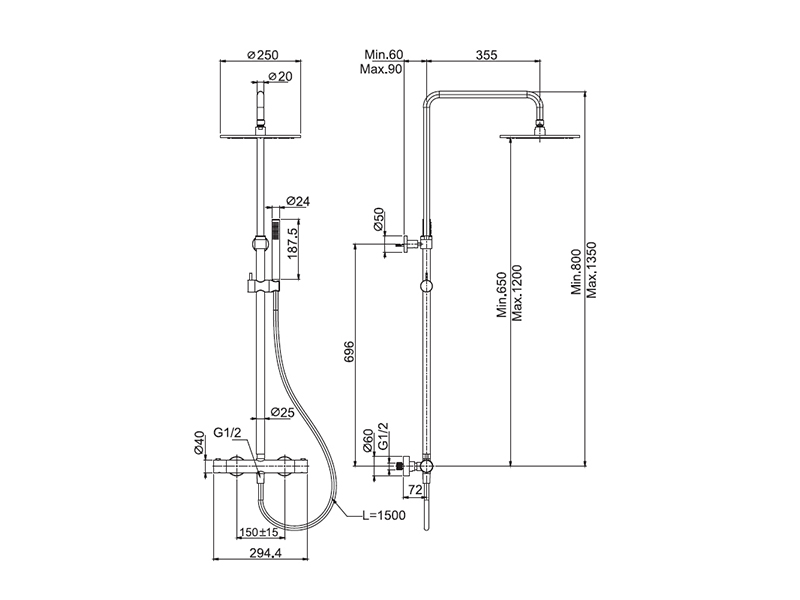 Смеситель для душа термостатический внешнего монтажа с душевой стойкой Fima Carlo Frattini SPILLO STEEL F4385/R25SINOX, цвет нержавеющая сталь. 2 подвода воды 1/2 с эксцентриком, душ из нержавеющей стали Ø 250 mm, регулируемая высота, кнопка ограничения напора на 50%, переключатель на ручке, ручной душ из высококачественной