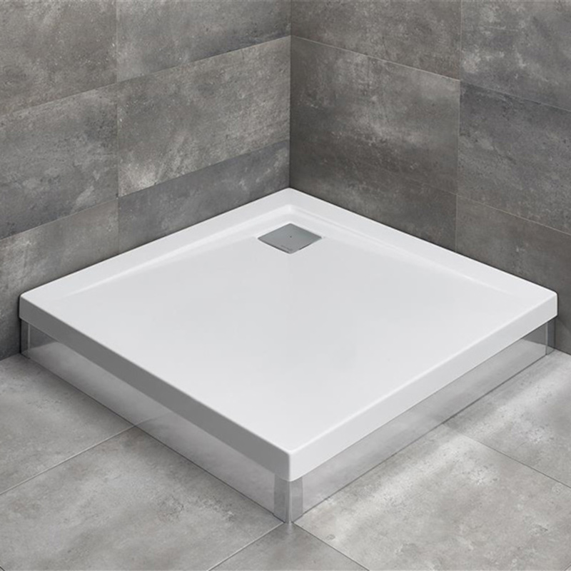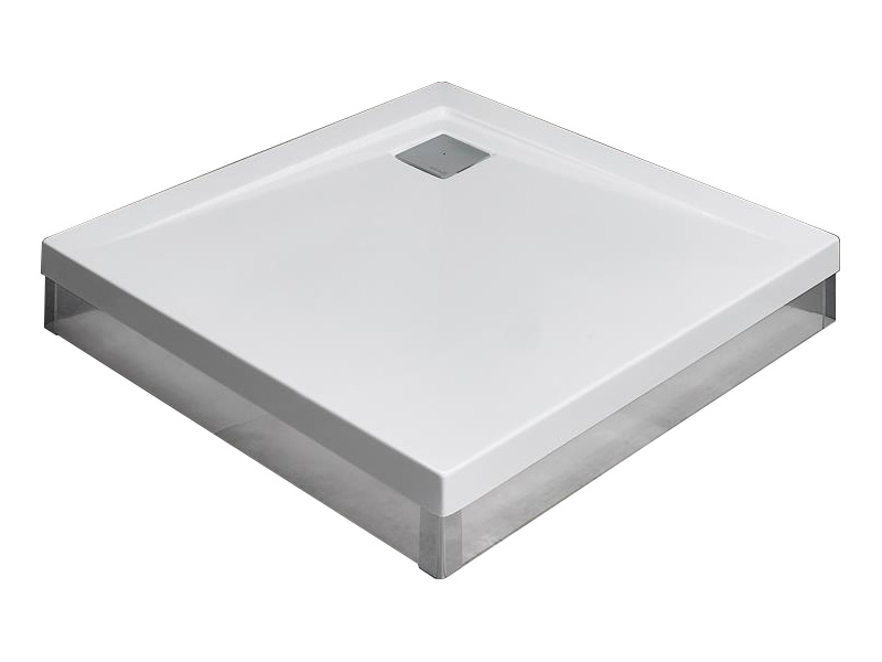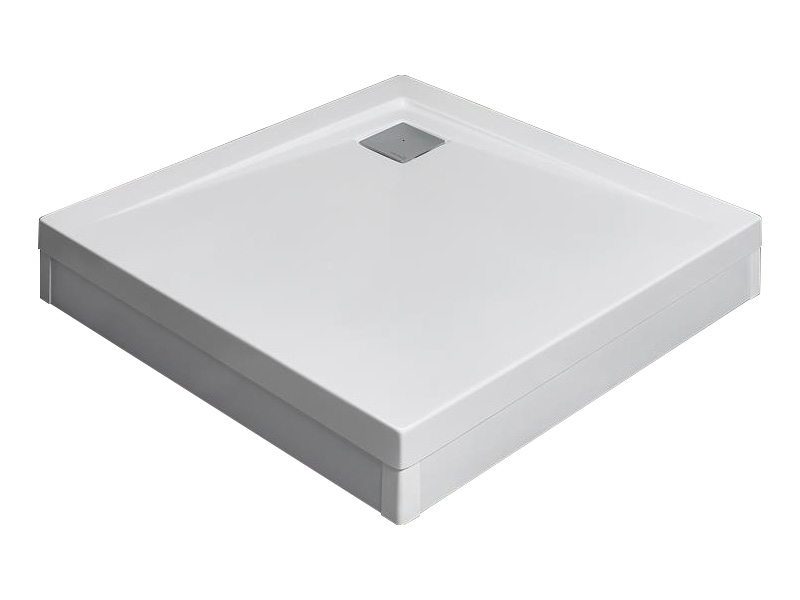 Квадратный плоский акриловый поддон с ножками в комплекте. Панель (из алюминия в белом либо хромированном цветах) покупается отдельно. Предназначенный для монтажа на ножках. Отверстие для сифона Ø90мм. Рекомендуемый сифон R399 — с квадратной крышкой. Размер 90x90x14.5 см, цвет белый.