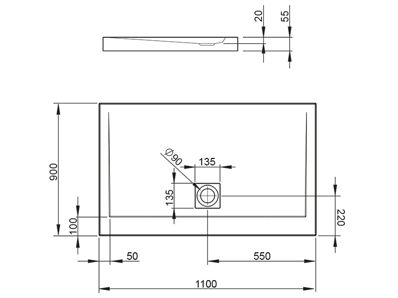 Плоский прямоугольный акриловый поддон. Предназначенный для монтажа без ножок — необходимо приклеить на строительный раствор или пену с низким коэффицентом расширения. Отверстие для сифона Ø90мм. Рекомендуемый сифон R399 — с квадратной крышкой.