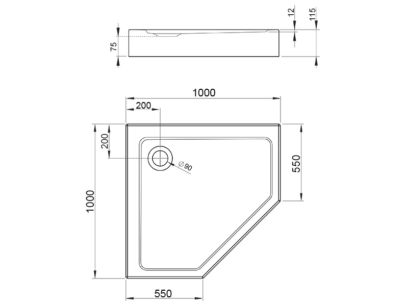 Плоский, 5-угольный акриловый поддонй с цельнолитой панелью (с 5-ти сторон). Предназначенный для монтажа на ножках (в комплекте). Отверстие для сифона Ø90мм по середине длинного бока. Рекомендуемый сифон: R500, R400 Slim. Размер 100x100x11.5 см, цвет белый.