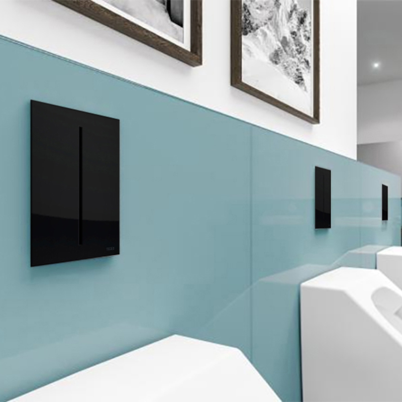 TECEfilo 9242063 Электронная панель смыва TECEfilo, стекло черное, питание от батареи 7,2 В. Комплект для монтажа бесконтактного инфракрасного смывного устройства, совместим с корпусом U 2 сливного клапана писсуара TECE; минимальное рабочее давление в системе — 0,5 бар; возможность настройки времени смыва, паузы для экономии воды, установки крышки писсуара, режима чистки, предварительного и гигиенического смывов.