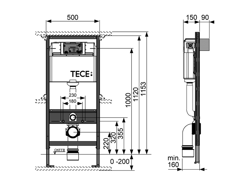 Инсталляция для унитаза TECE 9.300.000 (h = 1120 мм) для установки подвесного унитаза, фронтальное расположение панели смыва.