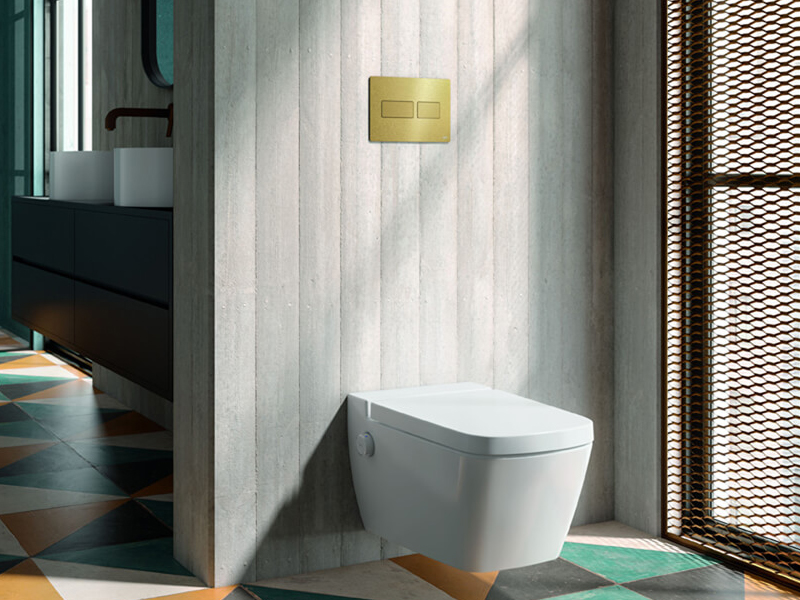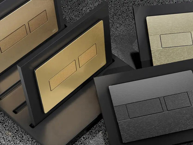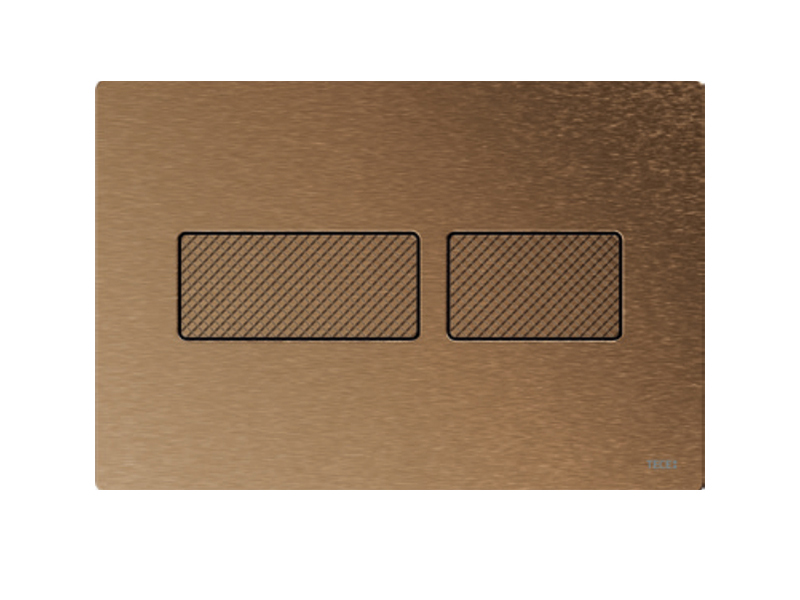 смыва цвета бронзы с текстурой ромба, прямоугольные клавиши с резиновыми накладками, в комплект входят толкатели и крепежные элементы. Панель смыва имеет скрытое винтовое крепление. Совместима с контейнером для гигиенических таблеток. Размеры (ш x в x г): 220 x 150 x 6 мм.