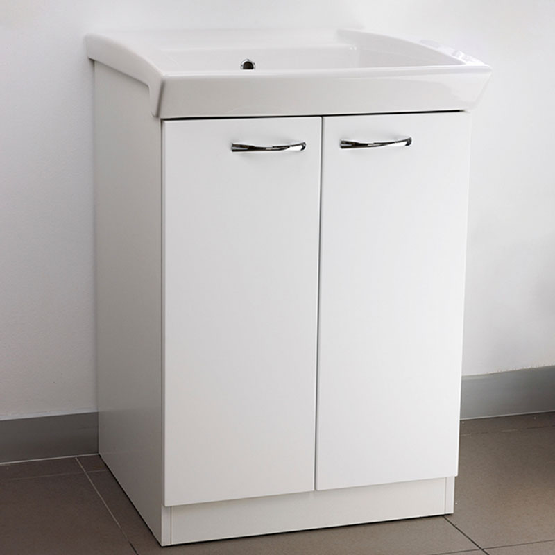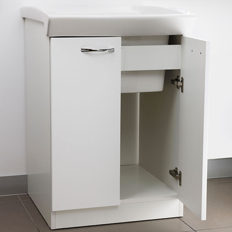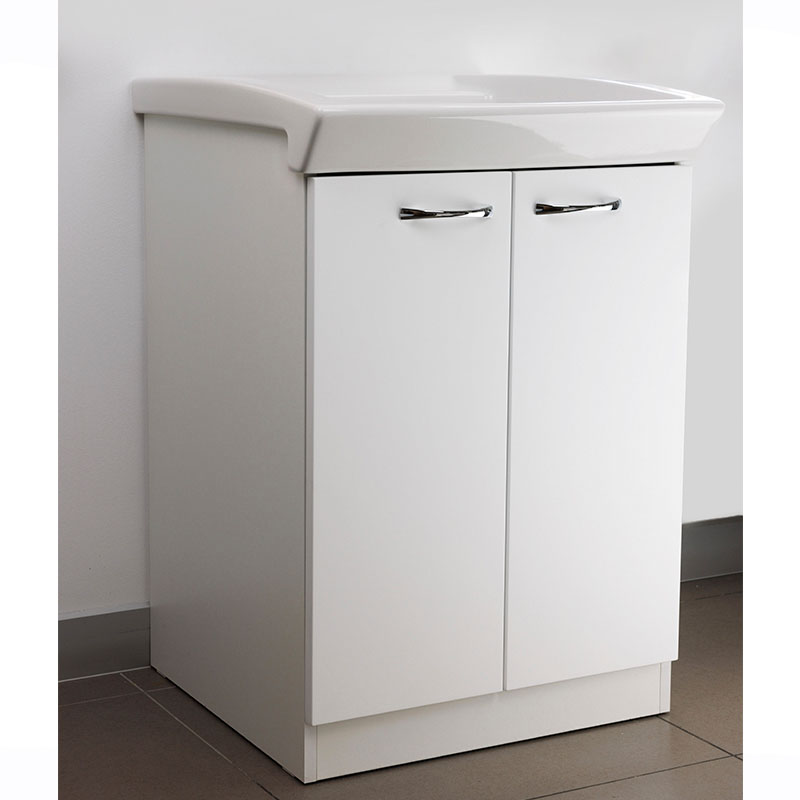 Хозяйственная керамическая раковина HATRIA, размер 60.5х60.5х33 см.c тумбой. Раковина имеет два намеченных отверстия под смеситель и перелив. Тумба выполнена из ЛДСП, с двумя распашными дверьми, цвет белый.