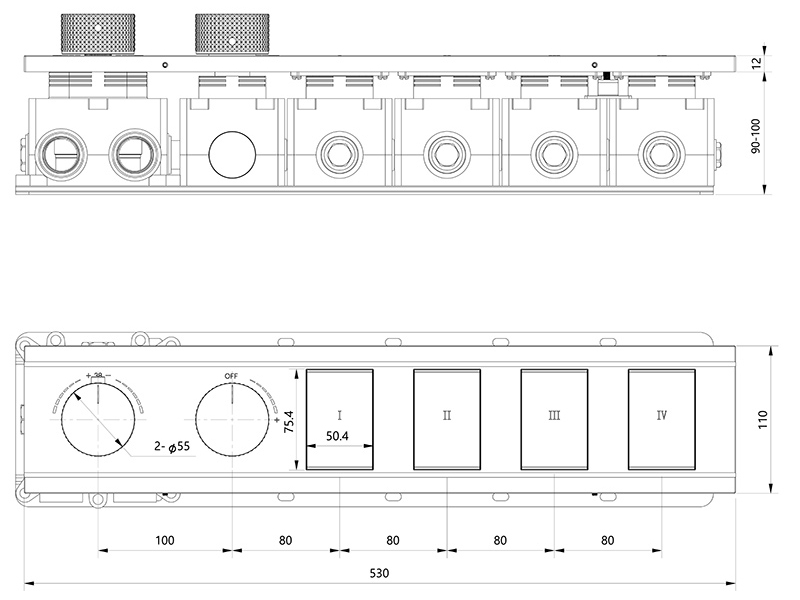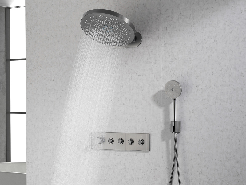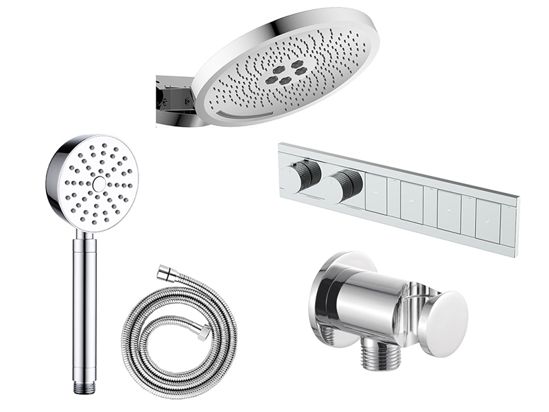Комплект скрытого термостатического многофункционального смесителя Аквант / Aquant на 4 выхода. Кнопки переключения, цвет хром. Верхний душ с 3 функциями. Ручной душ из латуни - в комплекте гибкий шланг для душа длиной 1,5 метра. Круглый держатель ручного душа с подключением воды.