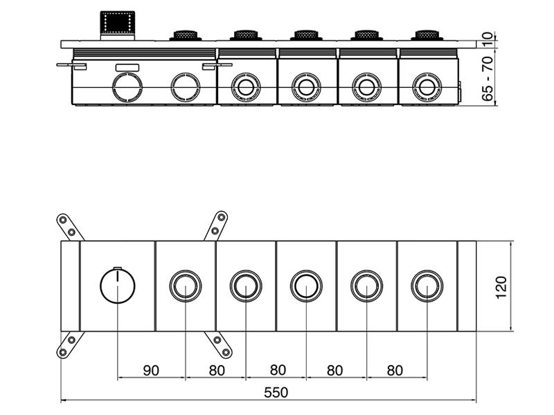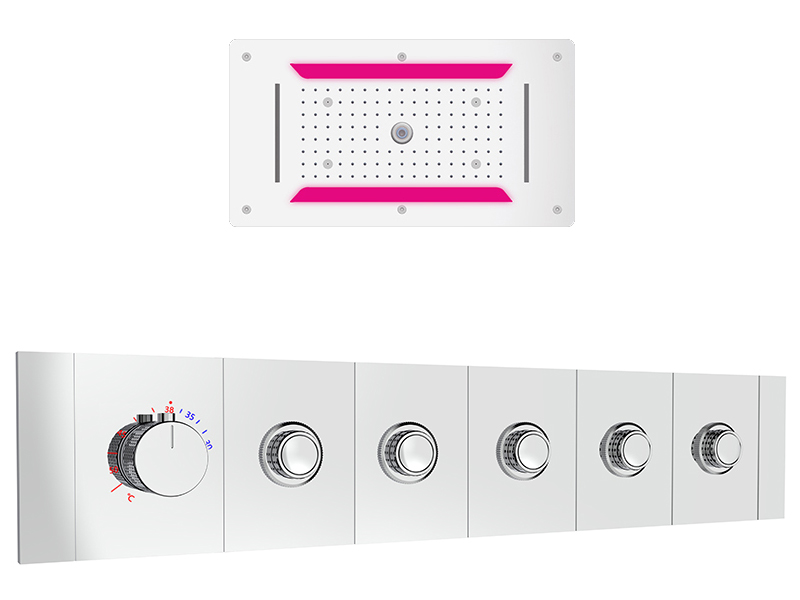 Комплект термостатического смесителя Аквант / Aquant встроенного на 5 выходов, горизонтальный монтаж, цвет хром. Потолочный душ прямоугольный с 4 режимами и подсветкой 70*38 см, хром.