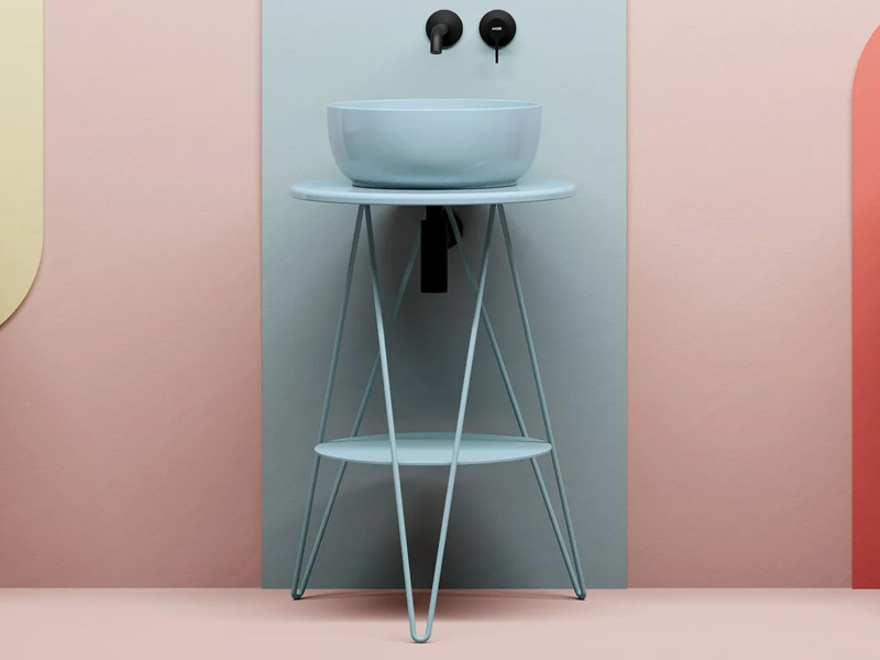 Scarabeo GUSTAV 5060 Консоль под раковину с отверстием под раковину посередине. Современная консоль с возможностью индивидуального оформления. Она изготовлена из металла, имеет легкую и воздушную конструкцию с двумя круглыми поверхностями для размещения повседневных предметов. GUSTAV предлагается в широком диапазоне цветов, те же самые, которые Scarabeo использует для керамики. Размеры: D52x 76h см. Цвет Matt Air.