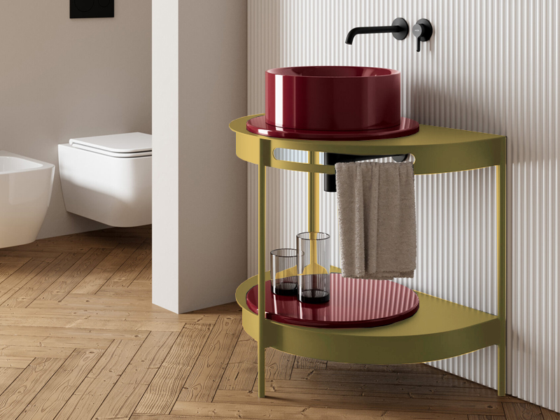 Scarabeo SESTO 5062. Консоль для ванной комнаты с простым минималистичным дизайном, который чрезвычайно функционален и имеет полукруглую форму. Металлическая конструкция со встроенным полотенцесушителем и две поверхности: одна для умывальника и одна в качестве столешницы, как место для хранения. Поверхности можно использовать без столешницы или с круглыми керамическими столешницами, доступными во всех цветах сантехники Scarabeo. Поверхность как глянцевая, так и матовая, позволяющая создавать индивидуальные композиции с желаемыми цветами. SESTO–это очаровательное решение, которое добавляет нотку элегантности в любую ванную комнату в современном стиле. Размеры: 84x56x7,5h см. Цвет Matt lime.