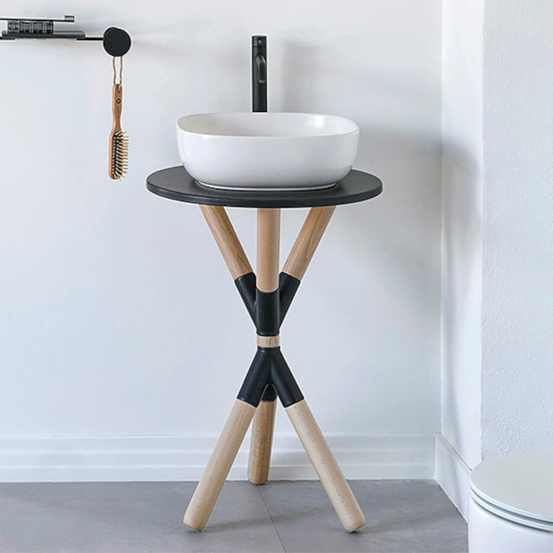 SCARABEO CROSS 2501 Консоль для раковины круглая с отверстием. Деревянные ножки в цвете светлого дерева, крестовина и столешница из керамики цвета Lava. Размеры: Ø52 x H76 Cm.