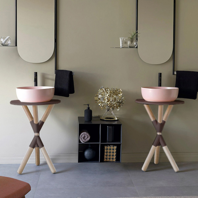 SCARABEO CROSS 2501 Консоль для раковины круглая с отверстием. Деревянные ножки в цвете светлого дерева, крестовина и столешница из керамики цвета Tobacco. Размеры: Ø52 x H76 Cm.