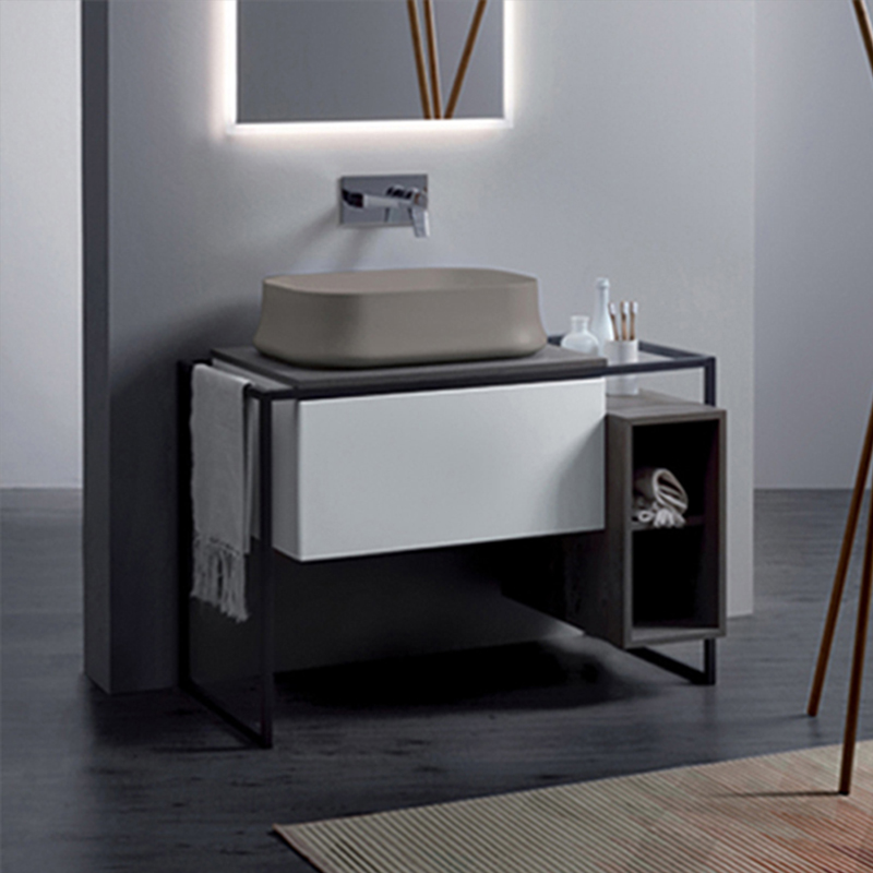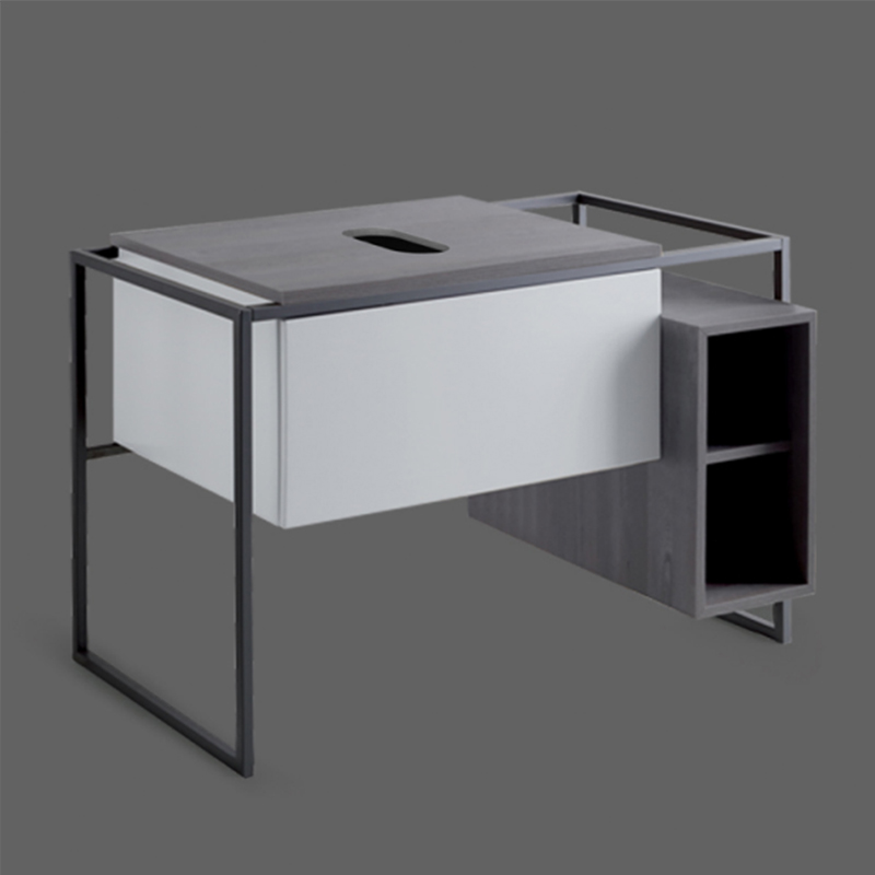 Металлическая структура с ящиком SIMAS FM 1 grey, ящик с механизмом открывания push pull, с открытым элементом. Сифон и монтажный набор включены. Размер 105x57x72 см. Ящик - белый матовый, открытый элемент и столешница - серый ясень.