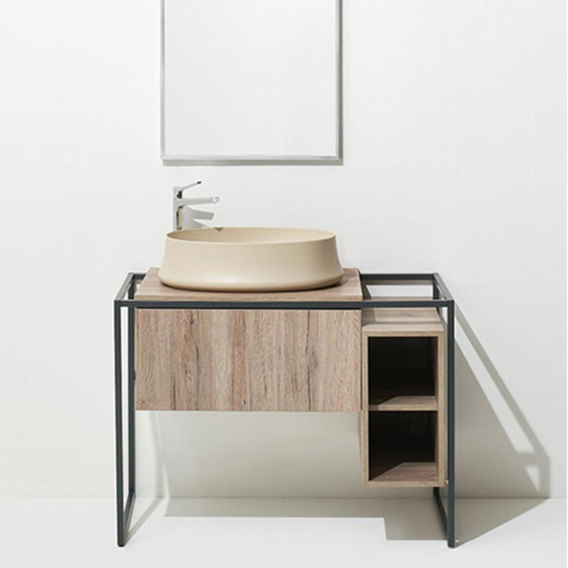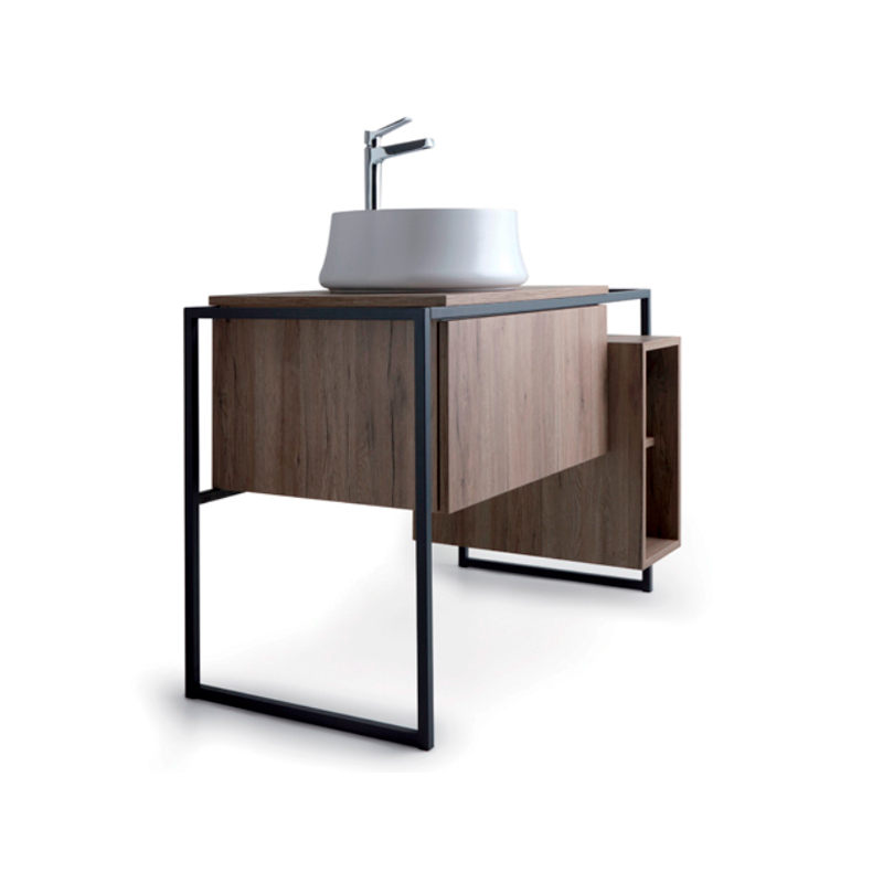 Металлическая структура с ящиком SIMAS FM 1 oak, ящик с механизмом открывания push pull, с открытым элементом. Сифон и монтажный набор включены. Размер 105x57x72 см. Ящик, открытый элемент и столешница - темный дуб.