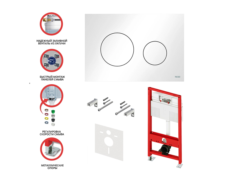 TECE Комплект TECEbase 3.0 с латунным вентилем для установки подвесного унитаза с панелью смыва TECEnow. Панель смыва белая глянцевая с круглыми клавишами. Комплектация: Комплект крепежных элементов для установки модуля; Смывной бачок объемом 10 л, выборочный слив большого (4,5/6/7,5/9 л) или малого (3 л) объема воды; Комплект крепежных элементов для установки унитаза (установочное расстояние 180 мм или 230 мм); Комплект патрубков с резиновыми манжетами для подсоединения унитаза; Фановый отвод 90/100 мм; Комплект защитных заглушек для патрубков; Шаблон для отделки отверстия под панель смыва; Комплект шумоизоляции; TECEnow панель смыва с двумя клавишами; Синее ограничительное кольцо для регулирования скорости смыва 100%.