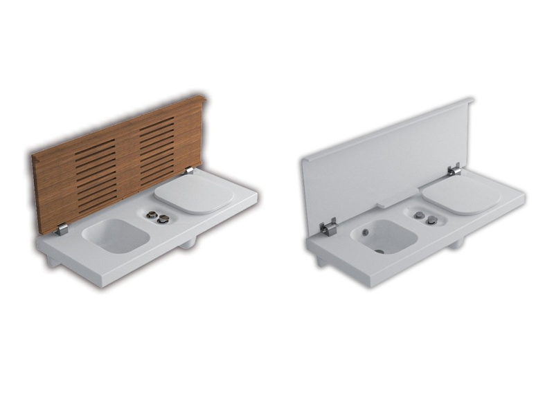 Многофункциональный модуль с унитазом и биде HATRIA G-FULL YXJQ01 с унитазом справа без крышки, размер 140x50 см, цвет белый. В комплекте со смесителем для биде, кнопкой слива и крышкой-сидением с микролифтом для унитаза. Возможна комплектация с крышкой цвета дерева или белого цвета. Возможен монтаж к стене, в нишу, в правый или левый угол. Монтаж на специальную инсталляцию для стен из кирпича, или на специальный кронштейн для стен из гипсокартона. Также дополнительно необходимо приобрести бачок скрытого монтажа Geberit “Sigma 8”. Возможна комплектация выдвижным ящиком белого цвета. Дополнительно приобретаются также сифон и донный клапан для биде.