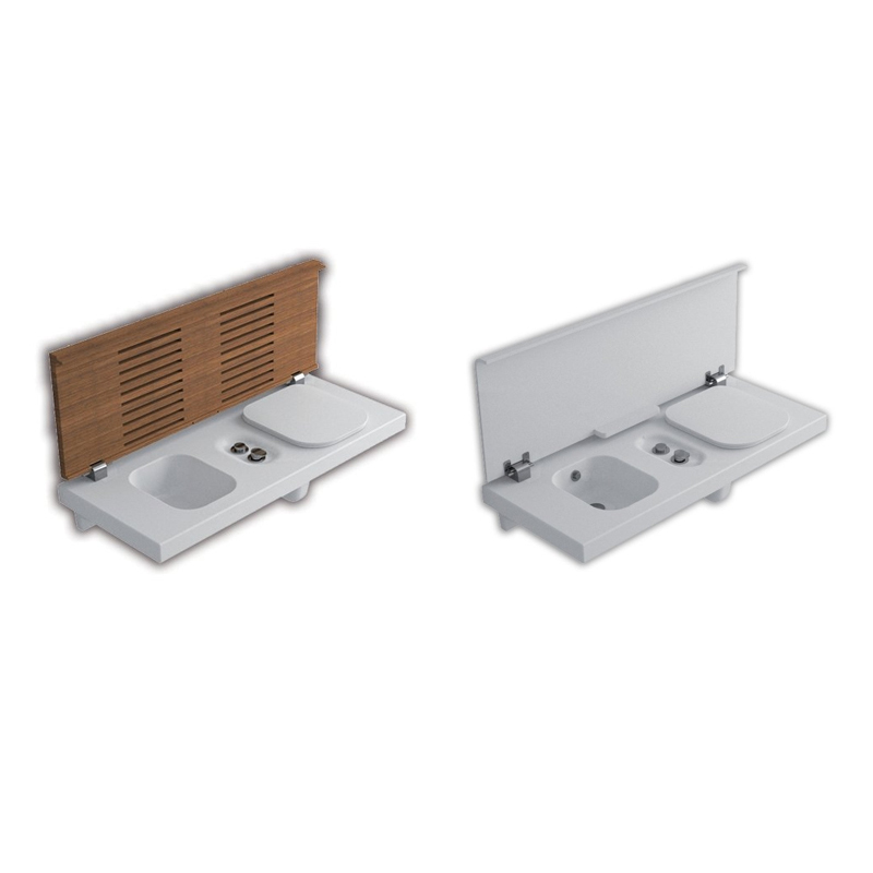 Многофункциональный модуль с унитазом и биде HATRIA G-FULL YXJS01 с унитазом справа без крышки, размер 120x50 см, цвет белый. В комплекте со смесителем для биде, кнопкой слива и крышкой-сидением с микролифтом для унитаза. Возможна комплектация с крышкой цвета дерева или белого цвета. Возможен монтаж к стене, в нишу, в правый или левый угол. Монтаж на специальную инсталляцию для стен из кирпича, или на специальный кронштейн для стен из гипсокартона. Также дополнительно необходимо приобрести бачок скрытого монтажа Geberit “Sigma 8”. Возможна комплектация выдвижным ящиком белого цвета. Дополнительно приобретаются также сифон и донный клапан для биде.