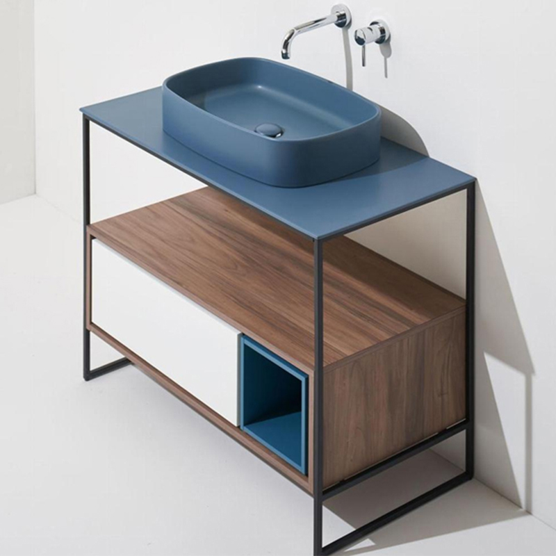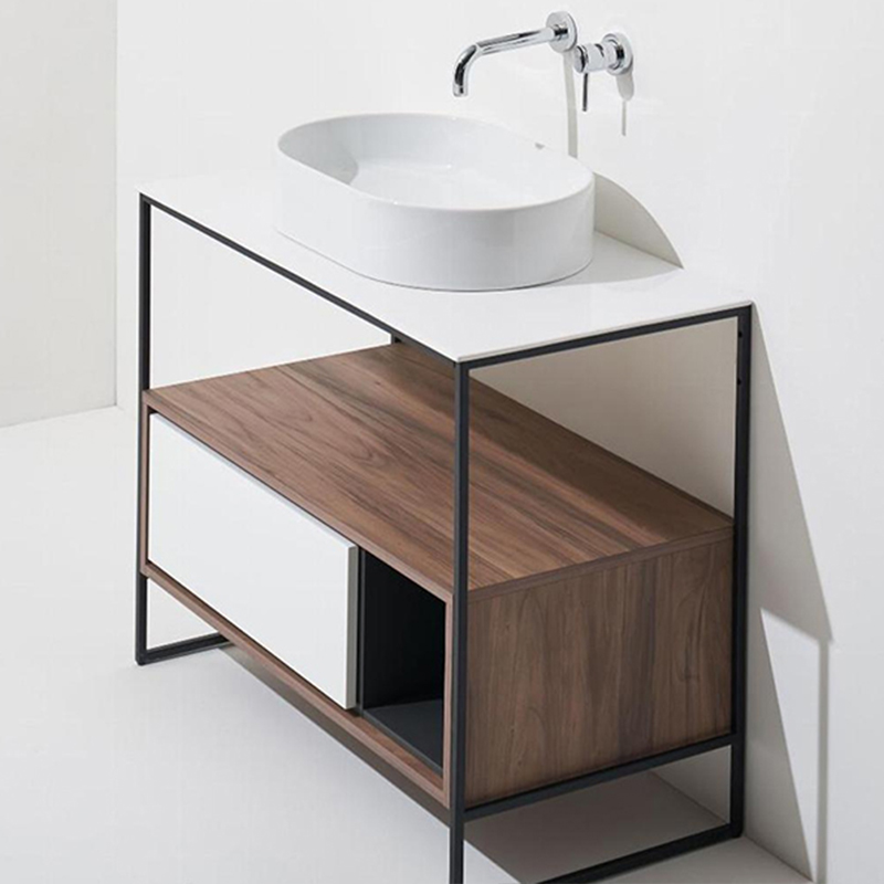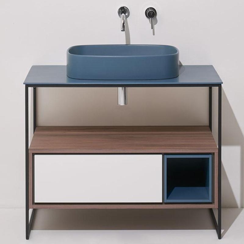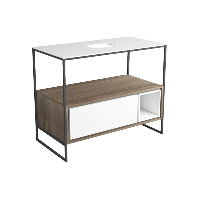 Напольная структура SIMAS FOLIO FOSC100 nero matt для керамической столешницы FO10. C ящиком цвета Sherwood (с системой открывания push to open) и белым матовым фронтальным фасадом. Дополнительно необходимо приобрести открытый элемент FOG и керамическую столешницу.