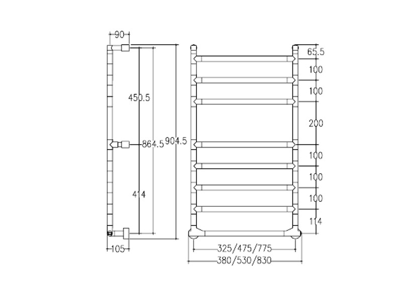 MARGAROLI SERENO 574/8 S Полотенцесушитель модульный стационарный электрический, лесенка 8 ступенек, скрытое электрическое подключение, выключатель справа. Диаметр трубы Ø25 mm. Размеры: 380х904.5x105mm, int.325mm. Электрический