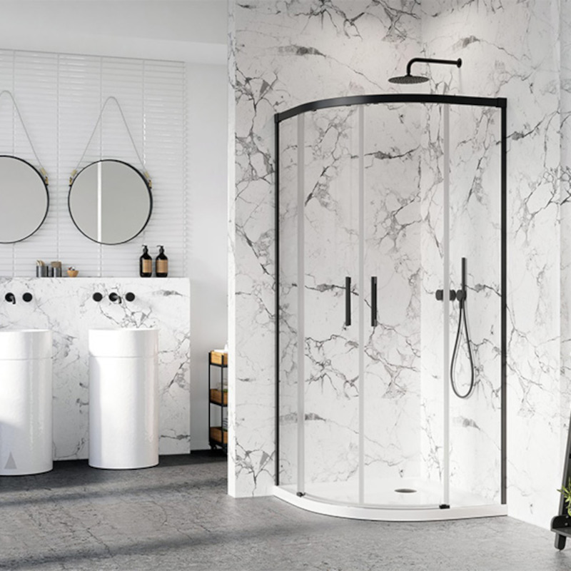 Idea BLACK PDD 90x90 - это полукруглая кабина с раздвижными дверцами с профилем черного матового цвета.