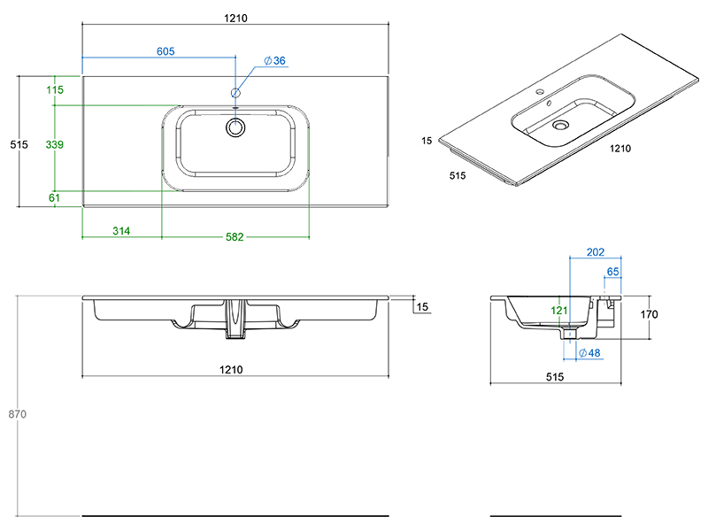Раковина керамическая QUADRA, 121х51,5 см, с одним отверстием под смеситель, для тумбы SUVBS(2C/3C), цвет POLVERE opaco. Продается только в комплекте с тумбой.