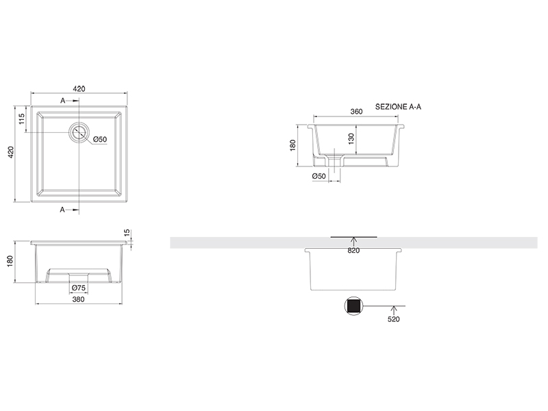 Технические детали: Встраиваемая раковина под столешницу с переливом, без отверстия под смеситель, идеально сочетает в себе функциональность и эстетику.