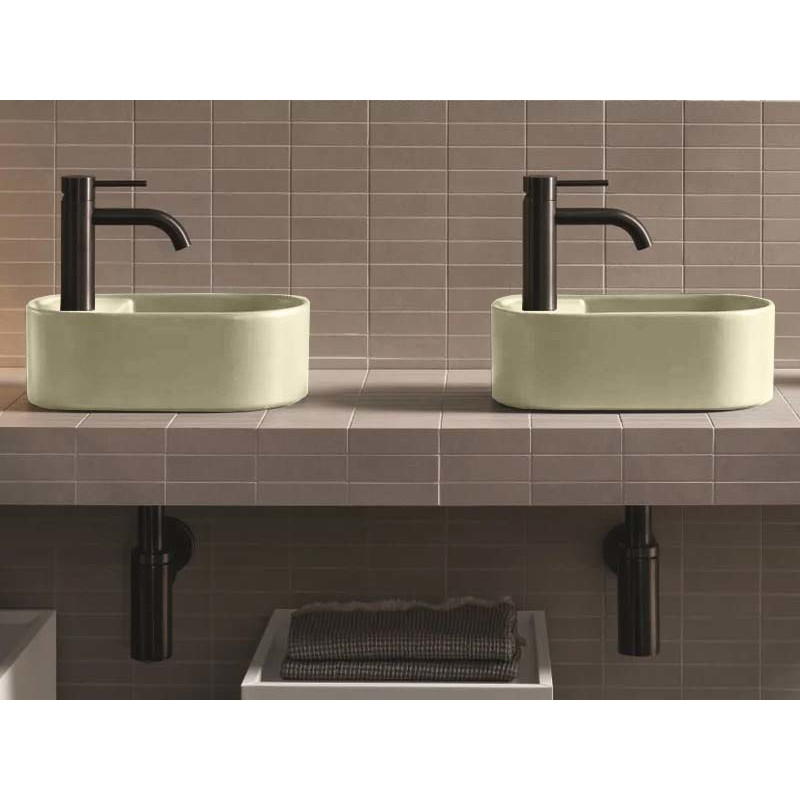 CIELO Les Petites Раковина накладная с одним отверстием под смеситель, без перелива. Все стороны покрыты эмалью. При установке на столешницу рекомендуется запросить опцию “RETTIFICA”. Размеры: 33,5x18,5x11,5h см. Цвет Canapa.