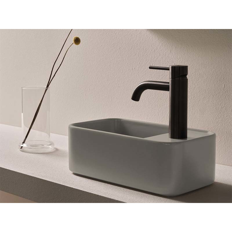 CIELO Les Petites Раковина накладная с отверстием под смеситель справа, без перелива. Все стороны покрыты эмалью. При установке на столешницу рекомендуется запросить опцию “RETTIFICA”. Размеры: 33,5x18,5x11,5h см. Цвет Avena.