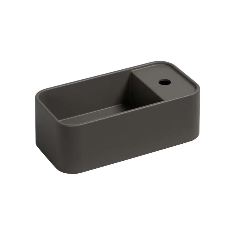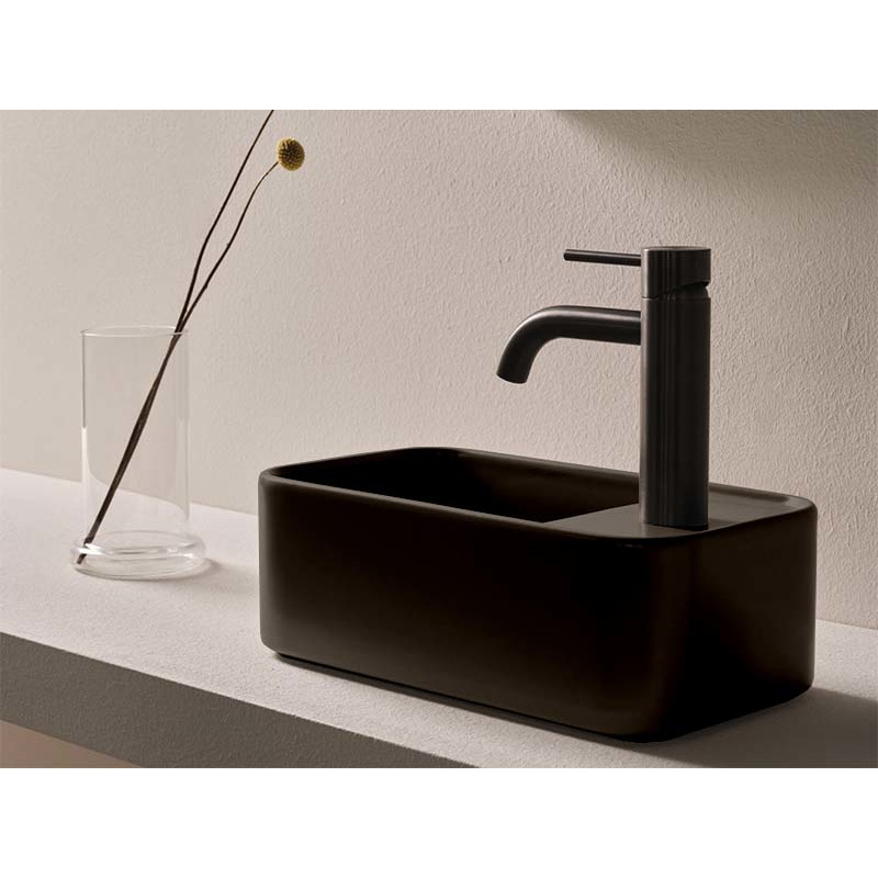CIELO Les Petites Раковина накладная с отверстием под смеситель справа, без перелива. Все стороны покрыты эмалью. При установке на столешницу рекомендуется запросить опцию “RETTIFICA”. Размеры: 33,5x18,5x11,5h см. Цвет Fango.