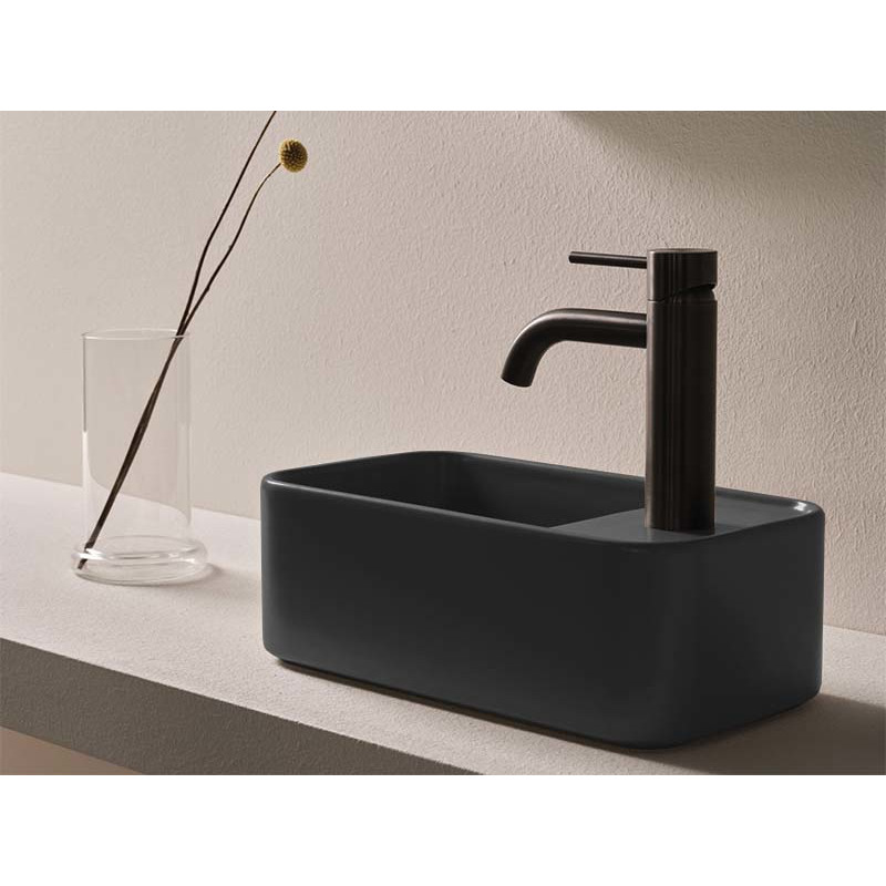 CIELO Les Petites Раковина накладная с отверстием под смеситель справа, без перелива. Все стороны покрыты эмалью. При установке на столешницу рекомендуется запросить опцию “RETTIFICA”. ВРазмеры: 33,5x18,5x11,5h см. Цвет Lavagna.