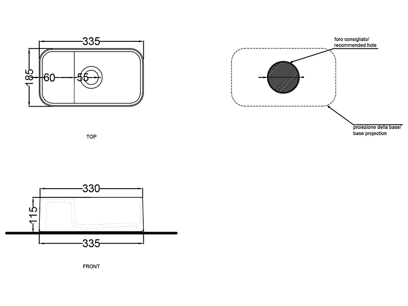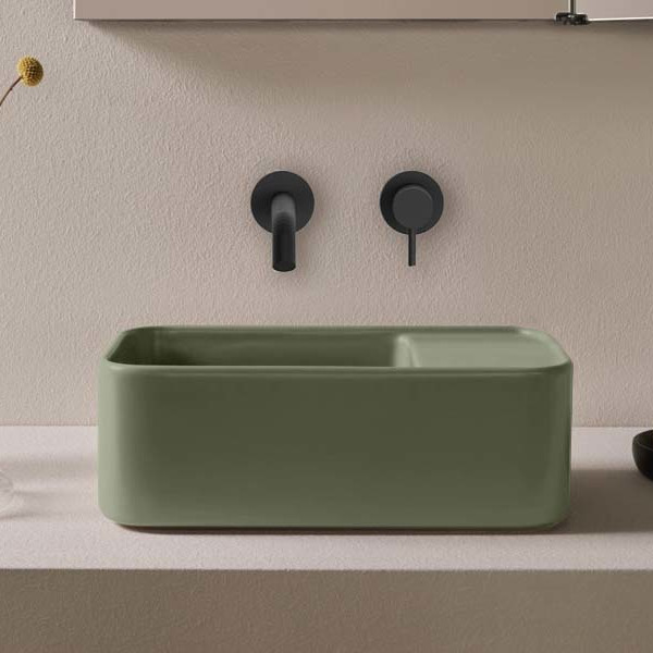 CIELO Les Petites Раковина накладная без отверстия под смеситель, без перелива. Все стороны покрыты эмалью. При установке на столешницу рекомендуется запросить опцию “RETTIFICA”. Размеры: 33,5x18,5x11,5h см. Цвет Agave.