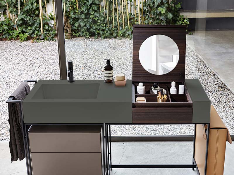 CIELO NARCISO NALA Раковина накладная на структуру и боковой элемент. Раковина с одним отверстием под смеситель с возможностью выполнения трех отверстий, без слива-перелива. цвет Cemento. Обязательное сочетание: раковина NALA + элемент " Make Up" NAMUL или NAMUE + Структура для раковины NAST.