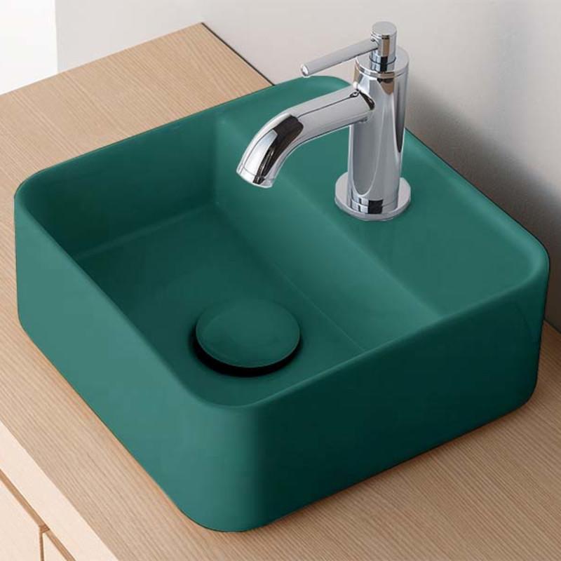 CIELO SHUI COMFORT LPLAQ Раковина накладная с одним отверстием под смеситель, без слива- перелива, все стороны покрыты эмалью, для установки на столешницу. Размеры: 28x28x11,5 h. Цвет Smeraldo.