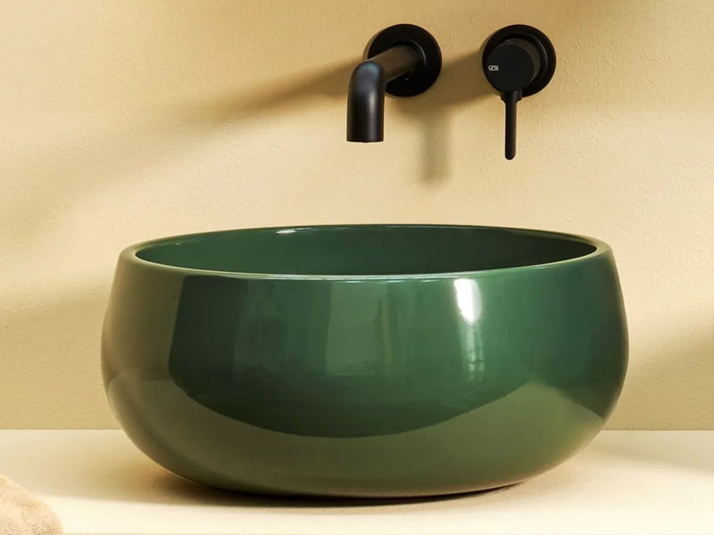 CIELO TINA BATO Раковина - чаша накладная без отверстия под смеситель, без слива- перелива. Все стороны покрыты эмалью. Рекомендуется установка на столешницу. Размеры: ø43 x 19 h см. Цвет Alga.
