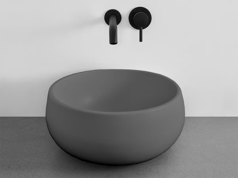 CIELO TINA BATO Раковина - чаша накладная без отверстия под смеситель, без слива- перелива. Все стороны покрыты эмалью. Рекомендуется установка на столешницу. Размеры: ø43 x 19 h см. Цвет Cemento.