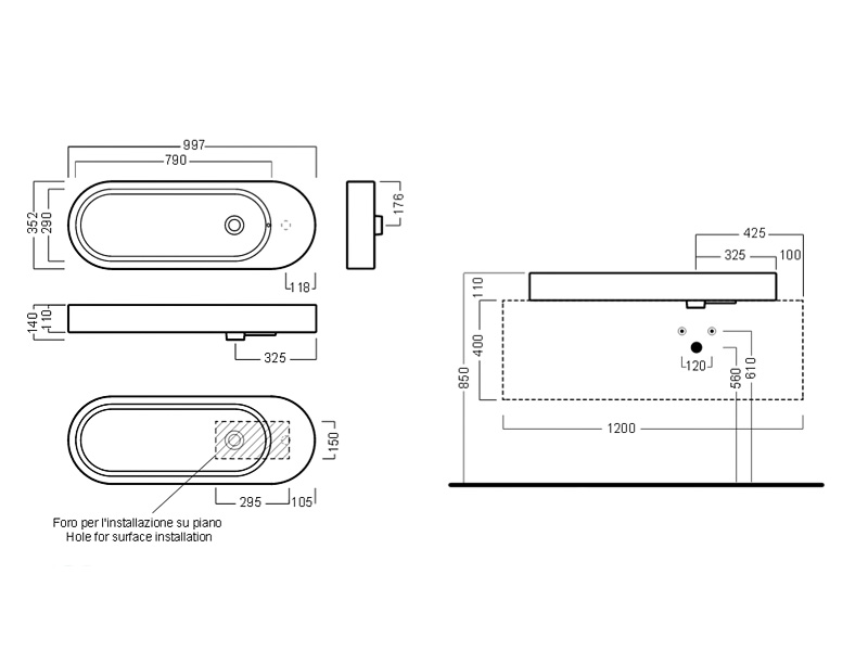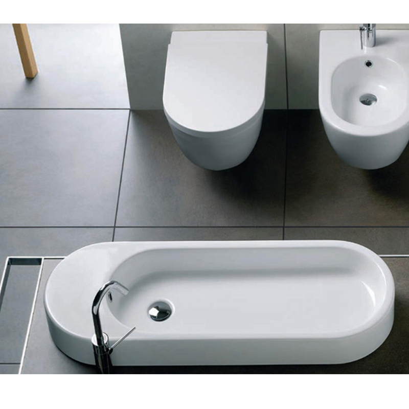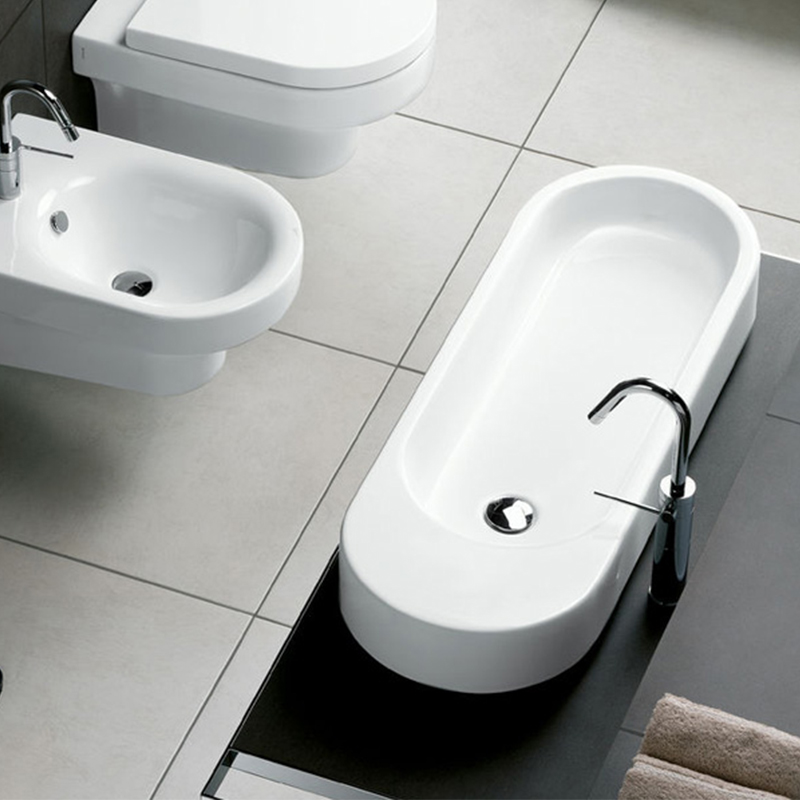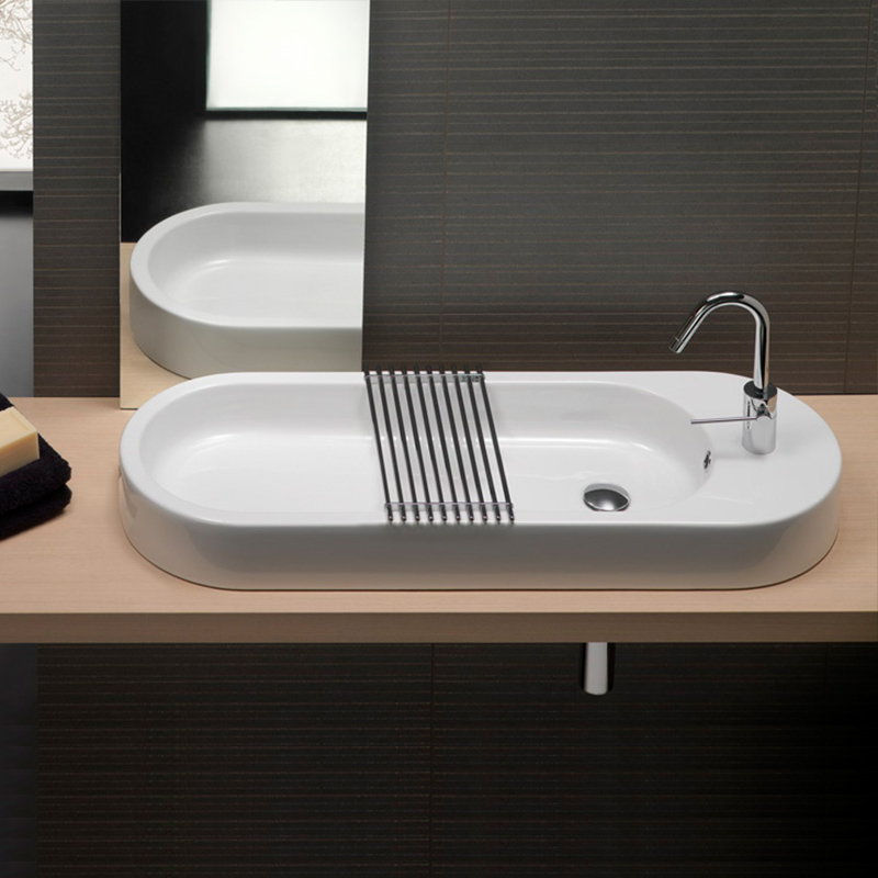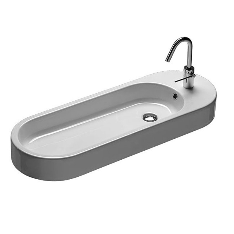 Раковина накладная HATRIA AREA Y0W101, без отверстий под смеситель, размер 100x35 см, цвет белый. Есть одно намеченное отверстие для смесителя. Донный клапан и сифон приобретаются отдельно.