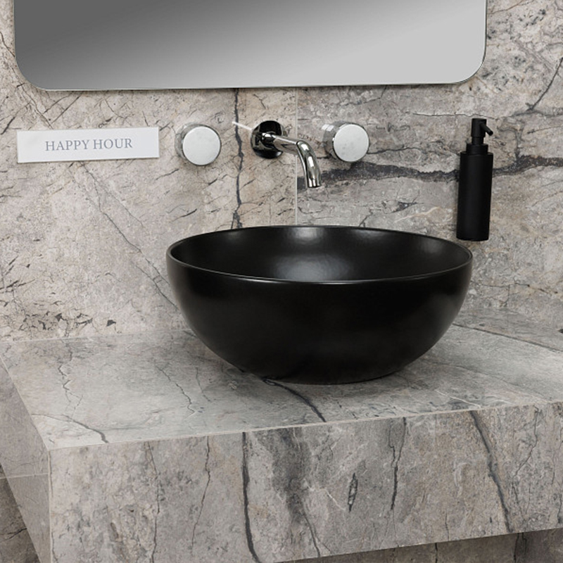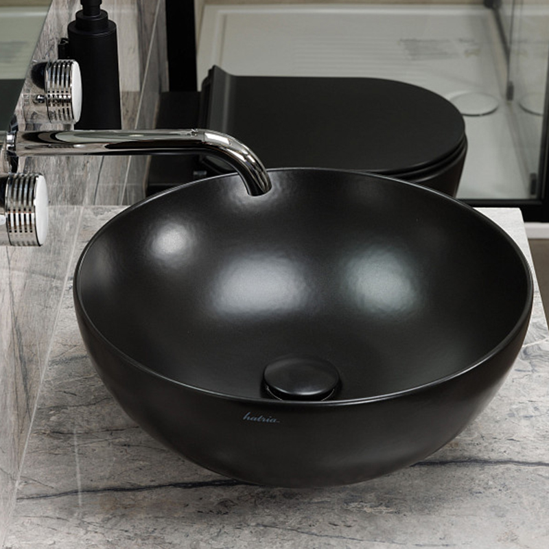 Раковина накладная HATRIA HAPPY HOUR A0Y1VF02, без отверстий для смесителя, без перелива, диаметр 44 см, цвет черный матовый. Донный клапан и сифон приобретаются отдельно.