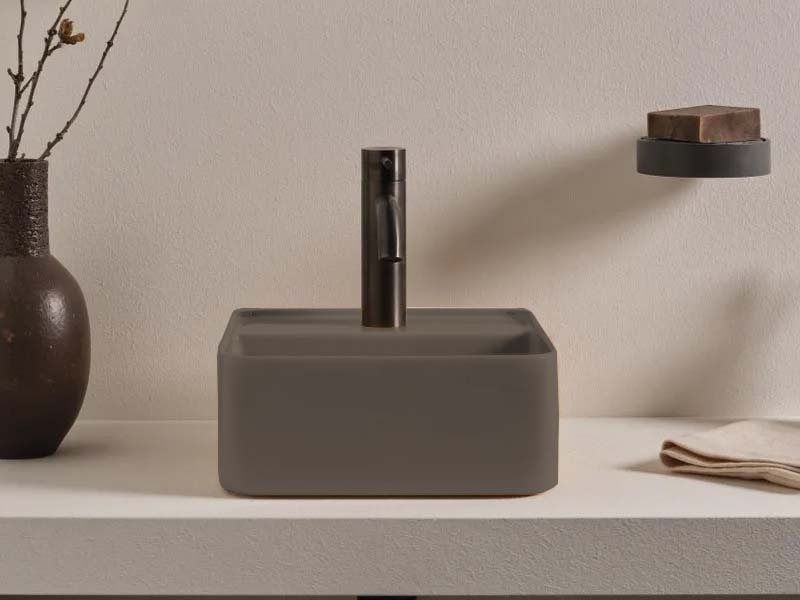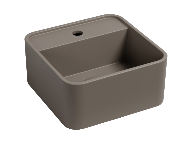 CIELO Les Petites Раковина квадратная накладная или подвесная с одним отверстием под смеситель, без слива-перелива. Все стороны покрыты эмалью. При установке на столешницу рекомендуется запросить опцию “RETTIFICA”. В комплекте с крепежами. Размеры: 35x35x16h см. Цвет Arenaria.