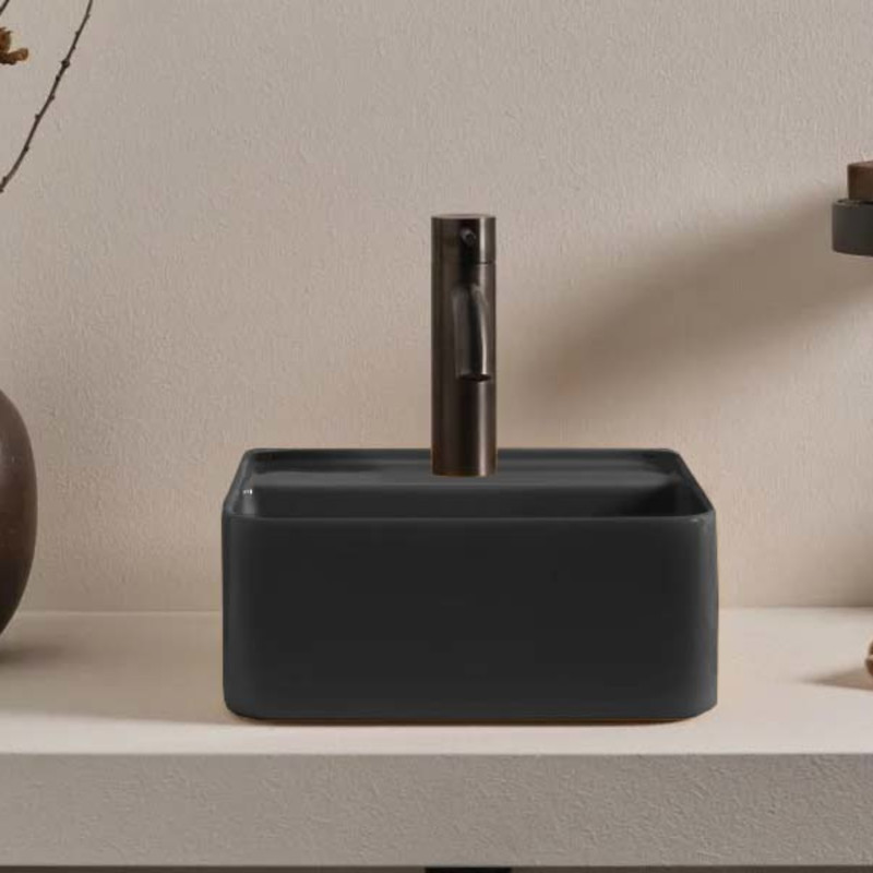 CIELO Les Petites Раковина квадратная накладная или подвесная с одним отверстием под смеситель, без слива-перелива. Все стороны покрыты эмалью. При установке на столешницу рекомендуется запросить опцию “RETTIFICA”. В комплекте с крепежами. Размеры: 35x35x16h см. Цвет Lavagna.