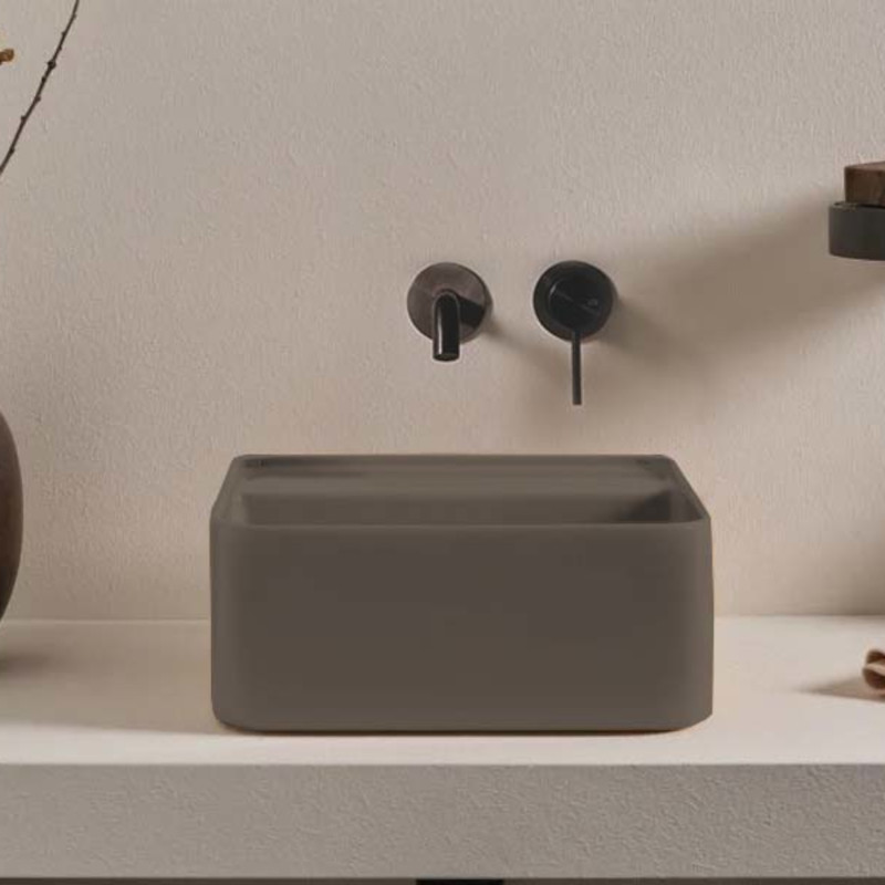 CIELO Les Petites Раковина квадратная накладная или подвесная без отверстия под смеситель, без слива-перелива. Все стороны покрыты эмалью. При установке на столешницу рекомендуется запросить опцию “RETTIFICA”. В комплекте с крепежами. Размеры: 35x35x16h см. Цвет Arenaria.