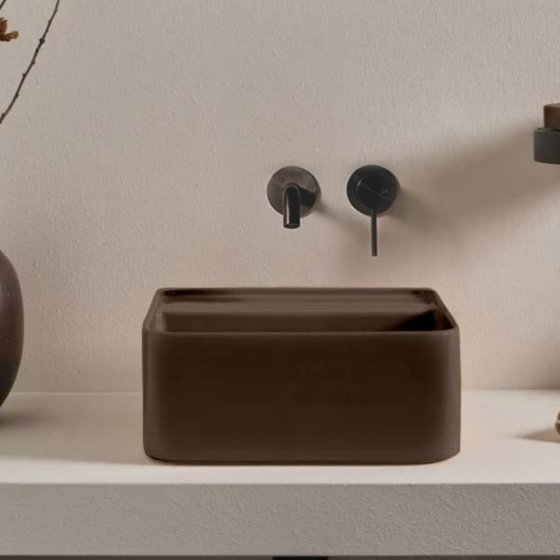 CIELO Les Petites Раковина квадратная накладная или подвесная без отверстия под смеситель, без слива-перелива. Все стороны покрыты эмалью. При установке на столешницу рекомендуется запросить опцию “RETTIFICA”. В комплекте с крепежами. Размеры: 35x35x16h см. Цвет Cacao.