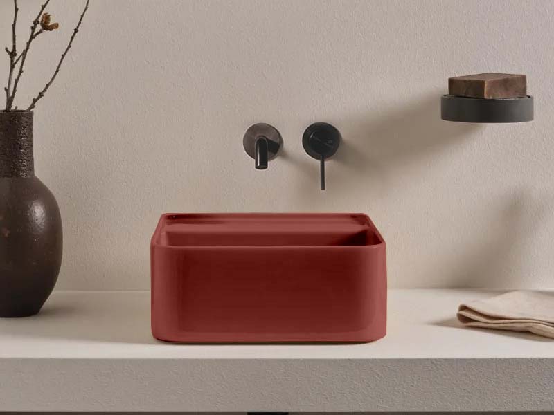 CIELO Les Petites Раковина квадратная накладная или подвесная без отверстия под смеситель, без слива-перелива. Все стороны покрыты эмалью. При установке на столешницу рекомендуется запросить опцию “RETTIFICA”. В комплекте с крепежами. Размеры: 35x35x16h см. Цвет Corallo.