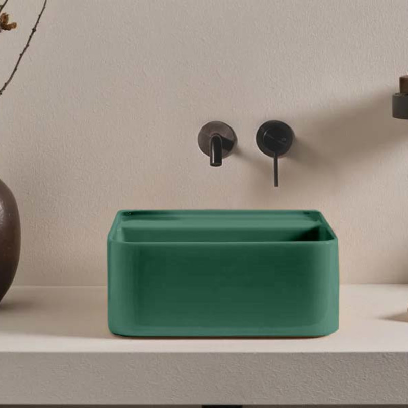 CIELO Les Petites Раковина квадратная накладная или подвесная без отверстия под смеситель, без слива-перелива. Все стороны покрыты эмалью. При установке на столешницу рекомендуется запросить опцию “RETTIFICA”. В комплекте с крепежами. Размеры: 35x35x16h см. Цвет Smeraldo.