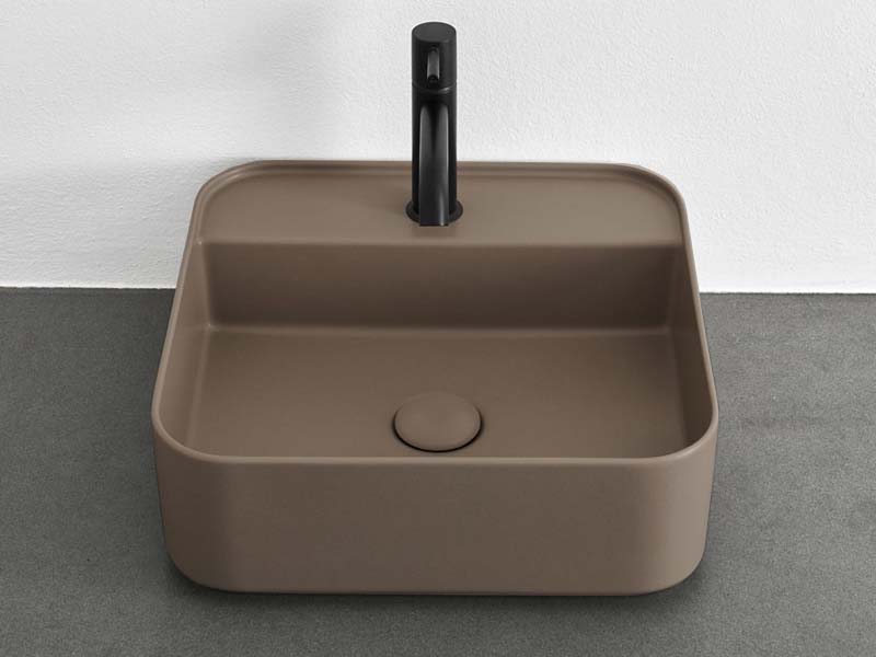 CIELO SHUI COMFORT SHCOLAQF Раковина накладная или подвесная с одним отверстием под смеситель с возможностью выполнения трех отверстий, без слива- перелива. В комплекте с крепежами. Одна сторона не покрыта эмалью. Размеры: 44x43x13h см. Цвет Arenaria.