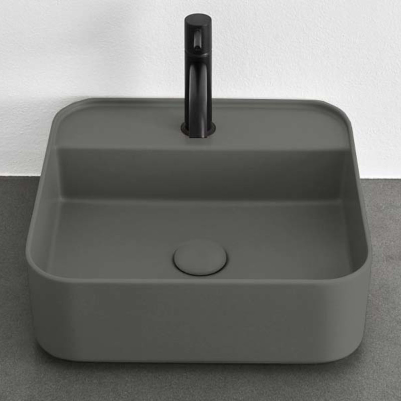 CIELO SHUI COMFORT SHCOLAQF Раковина накладная или подвесная с одним отверстием под смеситель с возможностью выполнения трех отверстий, без слива- перелива. В комплекте с крепежами. Одна сторона не покрыта эмалью. Размеры: 44x43x13h см. Цвет Cemento.