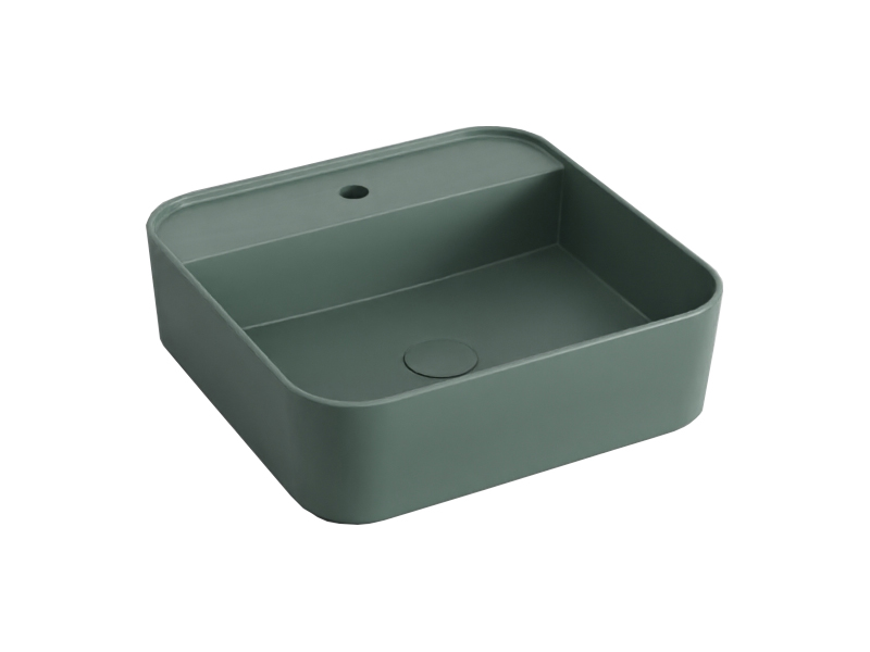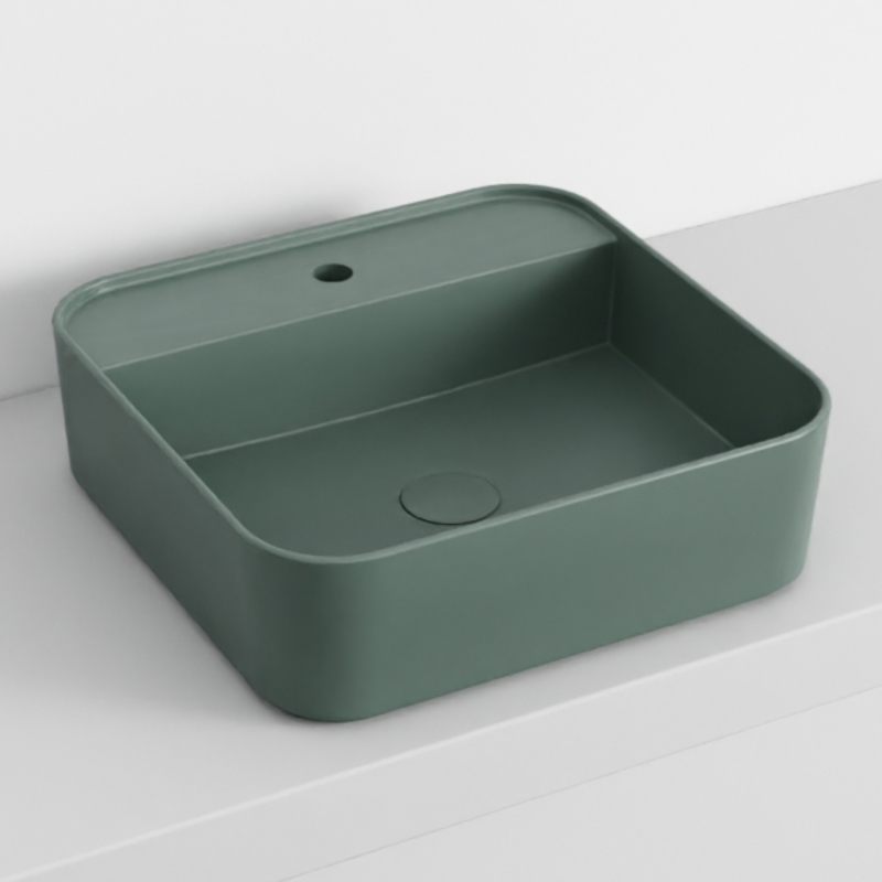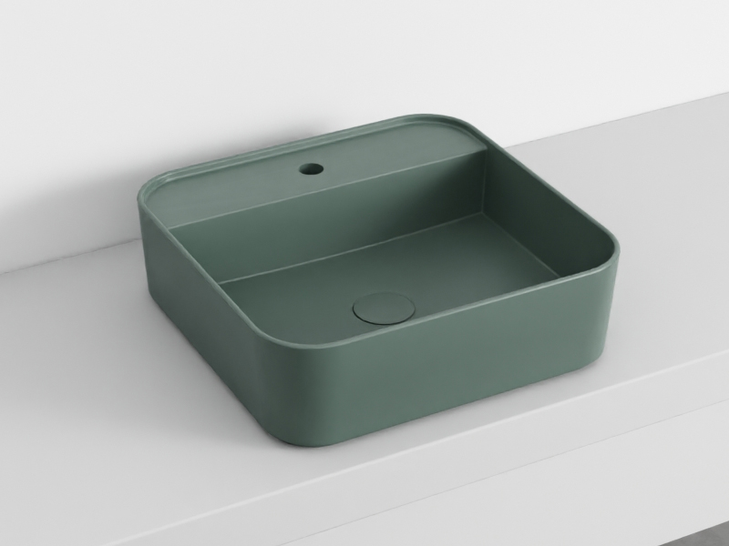 CIELO SHUI COMFORT SHCOLAQF Раковина накладная или подвесная с одним отверстием под смеситель с возможностью выполнения трех отверстий, без слива- перелива. В комплекте с крепежами. Одна сторона не покрыта эмалью. Размеры: 44x43x13h см. Цвет Muschio.
