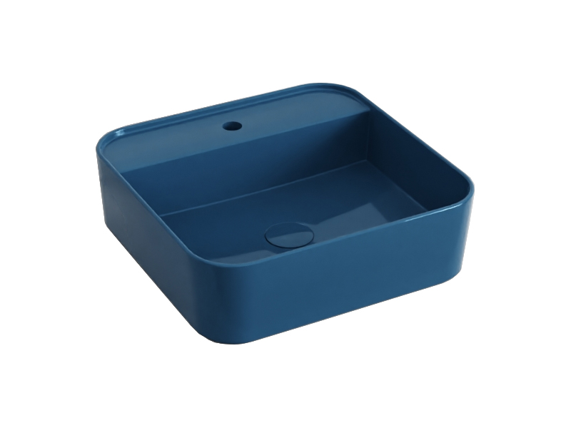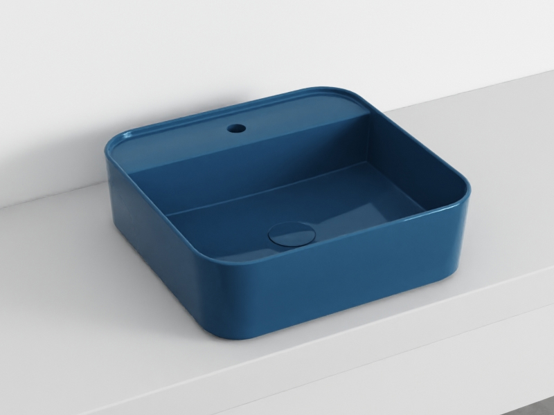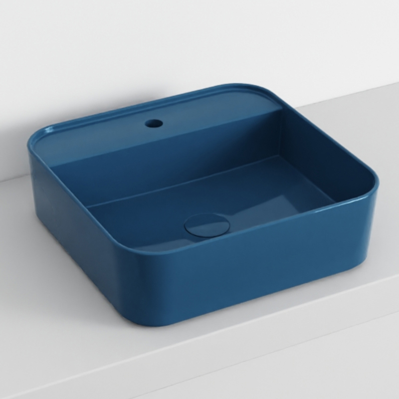 CIELO SHUI COMFORT SHCOLAQF Раковина накладная или подвесная с одним отверстием под смеситель с возможностью выполнения трех отверстий, без слива- перелива. В комплекте с крепежами. Одна сторона не покрыта эмалью. Размеры: 44x43x13h см. Цвет Oltremare.